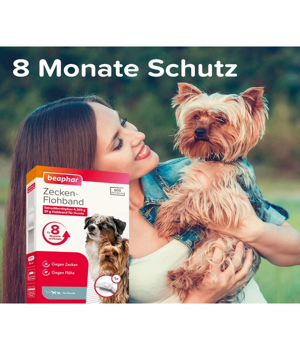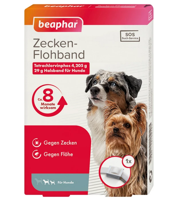 Schützen Sie Ihren vierbeinigen Liebling effektiv vor Zecken und Flöhen mit dem Hundezubehör von beaphar. Das beaphar Zecken-Flohband für Hunde hält Lästlinge bis zu acht Monate fern. Für Hunde können Zecken und Flöhe nicht nur unangenehm, sondern auch gesundheitsgefährdend sein. Zudem sind Zecken auch Überträger von für Menschen gefährlichen Krankheiten. Der geruchsneutrale, gut verträgliche Wirkstoff Tetrachlorvinphos wird kontinurierlich vom behapar Zecken-Flohband für Hunde abgegeben und verteilt sich mit dem Hautfett über den ganzen Hundekörper. Bei Regen schütz das Zeckenhalsband wirkungsvoll Ihren Hund vor Zecken und Flöhe, da es wasserfest ist. Das Hundezubehör hat eine Länge von 60 cm und ist damit ideal für Hunde mittlerer Rassen geeignet. Locker am Hals Ihres Hundes befestigt, wird der überstehende Rest einfach abgeschnitten. Als kostenloser Service für Sie: Über die im Halsband eingeprägte SOS-Kennnummer des beaphar SOS-Suchdienstes wird Ihr entlaufener Streuner schnell wieder an Sie vermittelt.