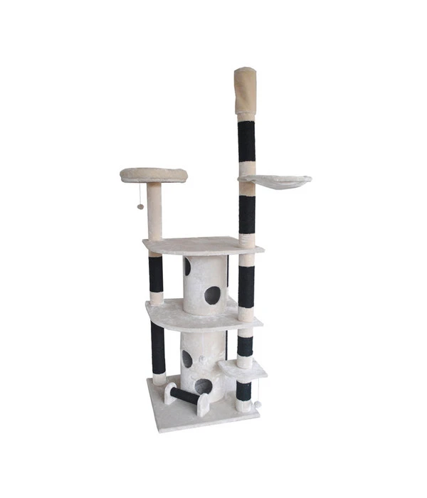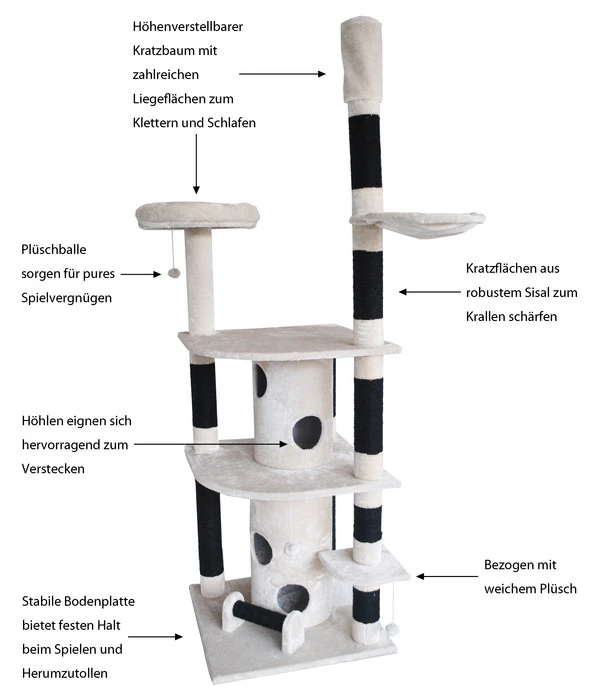 Der deckenhohe Kratzbaum Rufus von Dehner lässt Katzenherzen höher schlagen:perfekt zum Klettern, Faulenzen und Kratzen, dabei verteilt sich der Spielspaß auf mehrere plüschige Ebenen. Ein wahres Katzenparadies mit mehreren Liegeflächen, zwei Höhlen, Hängemulde, Spielbällen und vielen Kratzsäulen mit Sisal-Ummantelung. Sie können den robust gefertigten Dehner Kratzbaum Rufus in der Höhe von 240 bis 260 cm verstellen.