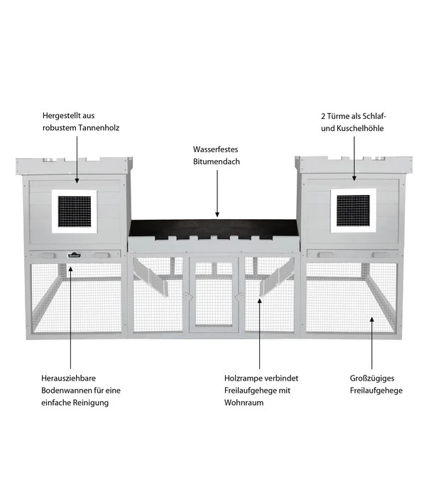 Wenn es um Ihre Zwergkaninchen geht, muss der Stall mehr als stabil und artgerecht konstruiert sein. Ihr Zuhause sollte nach Ihrem Geschmack schon auch etwas fürs Auge bieten. Deshalb sind Sie bei Ihrer Suche zielsicher beim Dehner Nagerheim Happy Home Nottingham gelandet. Dieser interessante Kaninchenstall wurde mit viel Liebe zum Detail in der Optik einer zweitürmigen Burg gestaltet. Das zeigen die stilechten Zinnen der Türme und am Gehegedach, perfekt abgerundet durch den grauen Anstrich. Für Ihre Kaninchen ist jedoch das Innenleben Ihrer neuen Burganlage wichtig. Sie werden es genießen, sich in den Kuschelhöhlen der beiden Türme zu verstecken, aneinander gekuschelt zu dösen oder versonnen an einem Heuhalm zu knabbern. Aber dann geht es wieder hinunter ins Freigehege. Dort wird getobt, geflitzt und wieder über die Leitern in die Turmzimmer geklettert. Sie werden schnell erkennen, welche Lebensfreude Ihre Fellnasen in ihrem Kleintierheim Dehner Happy Home Nottingham empfinden!