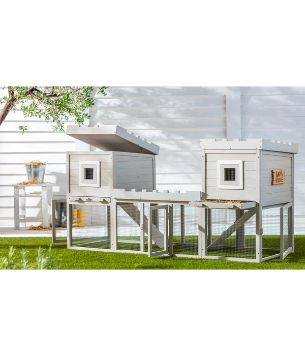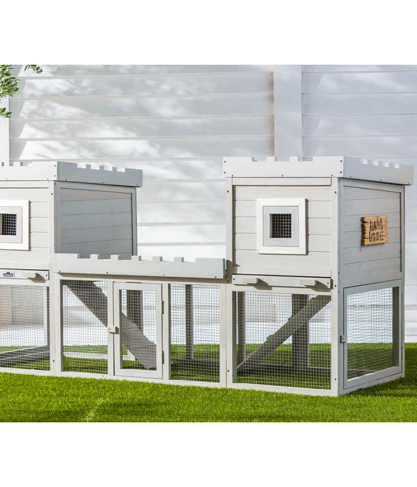 Natürlich wird Sie der Hasenstall Happy Home Nottingham von Dehner auch in puncto Qualität überzeugen. Er wurde aus Tannenholz angefertigt und mit einer umweltfreundlichen Lackierung versehen. Die Dächer der Türme und des Freigeheges sind mit wasserdichtem Bitumen eingedeckt. Das gesamte Freigehege, die Türen und die Fenster in den Türmchen wurden mit einem stabilen, kleinmaschigen Gitter bespannt, das sicher vor Feinden wie Marder schützt. Wichtig: Sie sind allesamt abschließbar.