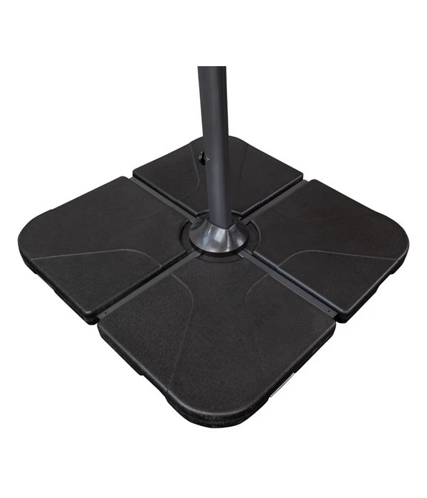 Die variabel füllbaren Schirmgewichte eignen sich hervorragend zum Beschweren kreuzförmiger Schirmständer aller Art, insbesondere auch für Ampelschirme und andere große Sonnenschirme. Leer sind die einzelnen Kunststoffmodule mit jeweils nur gut 2 kg dank der versenkbaren seitlichen Tragegriffe leicht zu transportieren. Bei Frostgefahr im Winter können Sie die wassergefüllten Gewichte gegebenenfalls einfach entleeren. Im Gegensatz zu herkömmlichen Steinplatten können bei diesen Beschwerungselementen gerade auch kleinere Kinder durch die abgerundete Form sicher am Boden spielen. Bestellen Sie zu den praktischen Beschwerplatten ein passendes Standkreuz doch gleich dazu. Dann steht der Gartenparty nichts mehr im Weg!