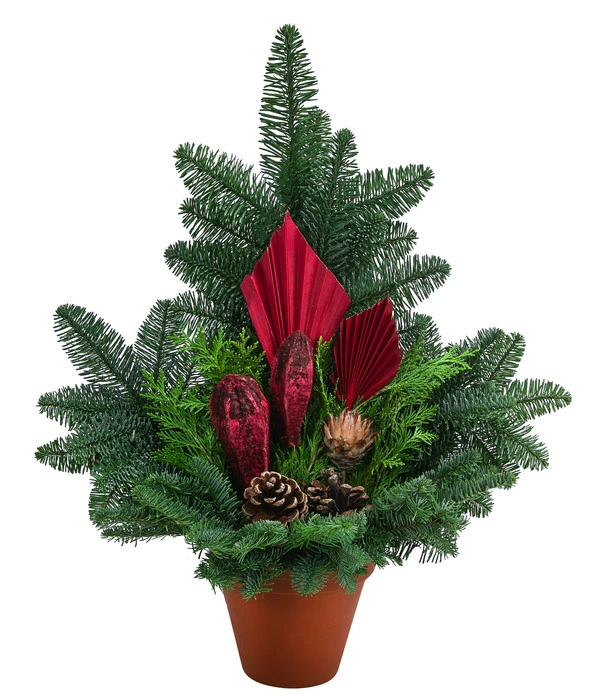 Möchten Sie die Grabstätte Ihrer verstorbenen Lieben gerne mit einem außergewöhnlichen Grabschmuck verschönern? Dann sollten Sie dieses handgefertigte Grabgesteck im Terrakotta-Topf kennenlernen. Es besticht durch seine moderne, pyramidale Form und exotische Deko-Elemente in leuchtenden Farben. Dieses Gesteck verleiht der letzten Ruhestätte eine ganz besondere Note. Mit einer Höhe von ca. 50 cm eignet es sich perfekt als einzigartiger Blickfang auf flach bepflanzten Gräbern. Immergrüne Tannenzweige bilden das stilvolle Grundgerüst und sind kunstvoll mit Trockenmaterialien wie Palmfächer, Mehogni und Nadelkissen bestückt.