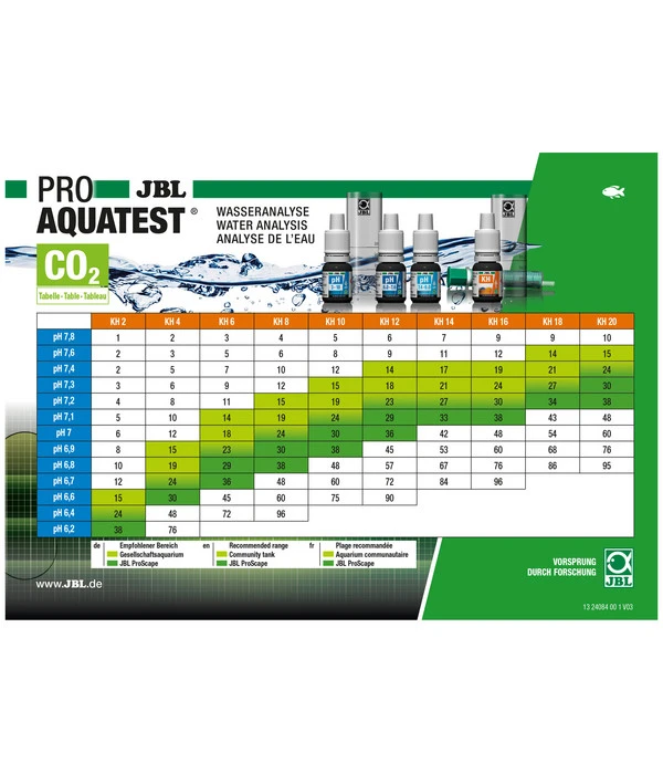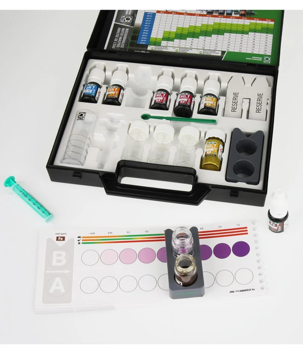 Mit dem Testkoffer der JBL Wasseranalyse ProAquaTest® Combiset Plus Fe können Sie folgende Wasserwerte bestimmen: pH-Wert, KH (Karbonathärte), Eisen, Nitrit, Nitrat und CO2. Für die Ermittlung des CO2-Gehalts genügt das Messen von pH und KH. Aus diesem beiden Werten ergibt sich der CO2-Gehalt des Wassers, der dann der beigelegten Tabelle entnommen werden kann. Und so einfach geht’s: Aquarienwasser in die Küvette mit Spritze geben, Indikator zugeben und Farbe mit der Farbskala vergleichen oder beim KH-Test die Tropfen bis zum Farbumschlag zählen.