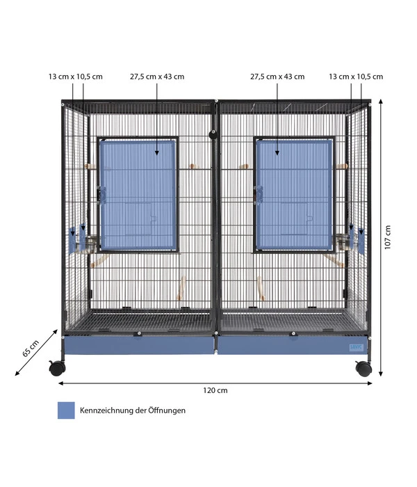 Das SAVIC Nager- und Vogelheim Tasmania 120 zeichnet sich durch sehr praktische und gute Eigenschaften aus: Durch sein abnehmbares Trenngitter lassen sich aus einem großen Käfig bei Bedarf auch zwei getrennte Käfige machen, die zum Reinigen und zum Füttern Ihrer Tiere jeweils durch eine große und eine kleinere Türe zugänglich sind. Zusätzlich dazu gibt es jeweils seitlich zwei kleine Futtertüren, um zum Beispiel ein Vogelbad oder einen Wassernapf einzuhängen. Beide Seiten vom SAVIC Nager- und Vogelheim Tasmania 120 verfügen unten über eine leicht herausziehbare Schublade aus Metall, die Ihnen die Reinigung des Käfigs zudem erleichtert. Auch das Bodengitter ist aus Metall, um ein Ausbrechen der Tiere während des Saubermachens zu verhindern.