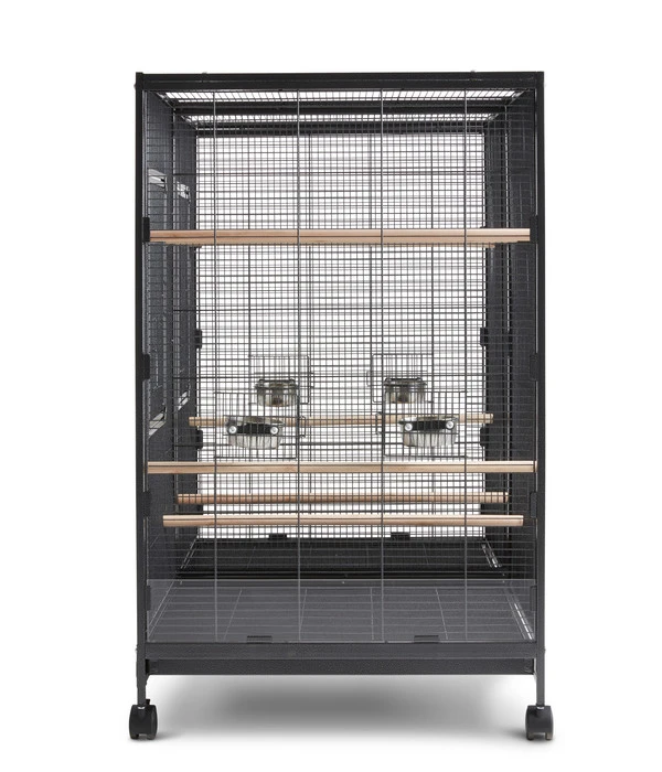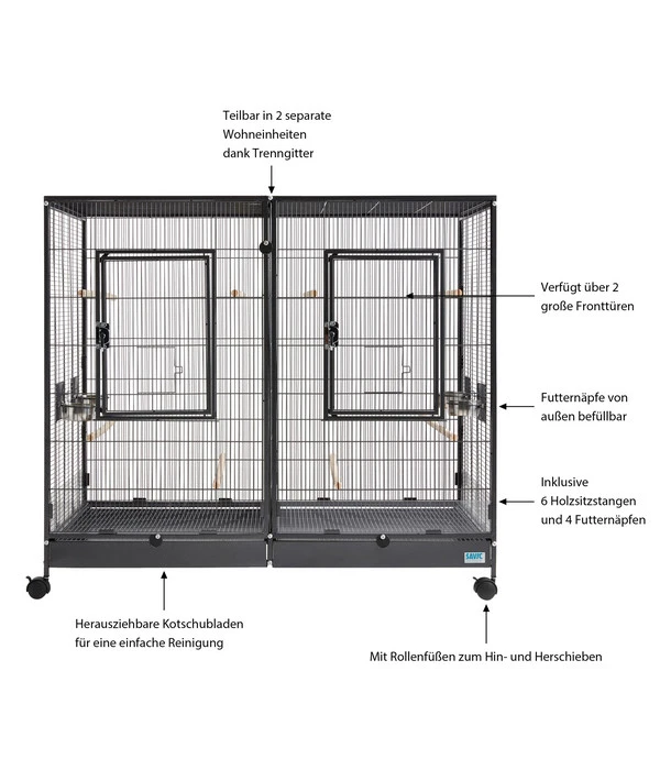 Voliere für Vögel und Kleintiere, auf Rollen, inkl. 6 Holzsitzstangen und 4 Futternäpfen, durch Trenngitter teilbar