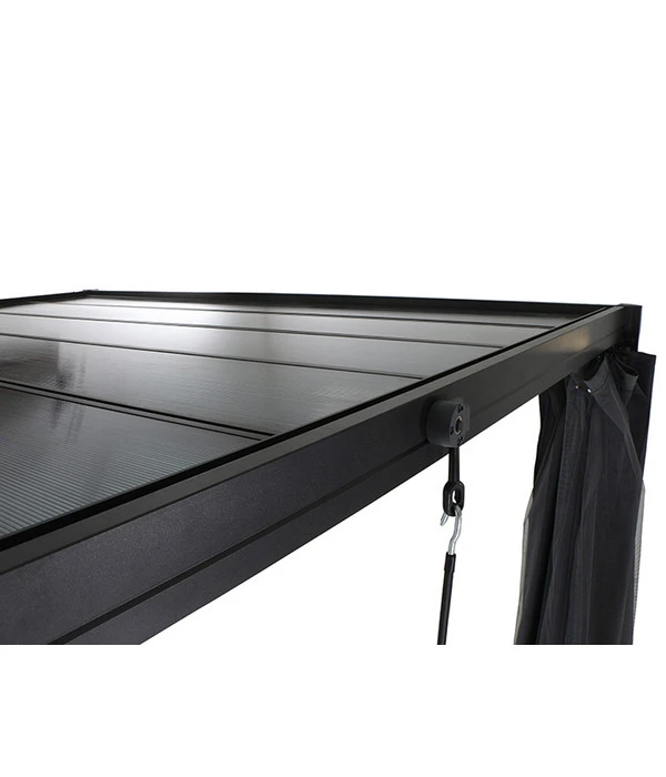 Der Siena Garden Pavillon Florenz hat ein solides Gestell aus Aluminium, das dank einer Pulverbeschichtung über eine ausgezeichnete Korrosionsbeständigkeit verfügt. Es ist außerdem gut witterungsbeständig und hält Sonne, Regen und UV-Strahlung bestens Stand. Das Dach besteht aus sieben Polycarbonat-Lamellen mit einer Stärke von 6 mm, die Sie manuell um 90° verstellen können und so mal mehr, mal weniger Sonne auf Ihrem Sitzplatz haben. Ausreichend hell ist es aber auch bei geschlossenen Lamellen, denn diese sind transparent.